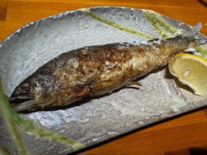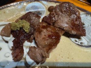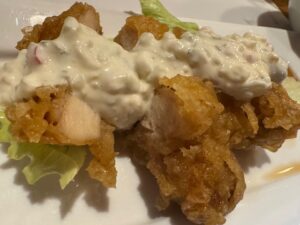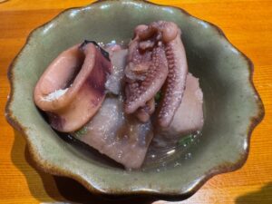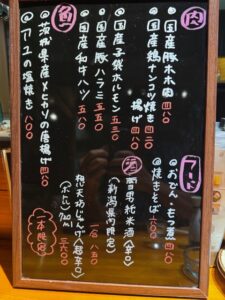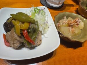 2回目の利用で夕食は済ませて来たもののお通しのポテサラ、常連客が持って来た油揚げ、明太子と山芋の茶碗蒸し、豚のロースソテーなどを頂いた。手作り感満載の優しいお味、特に茶碗蒸しはその日によって変わるがおいしい。お客さんの誰かがカラオケリクエストするとカラオケタイムに変わる。財布に優しいお店