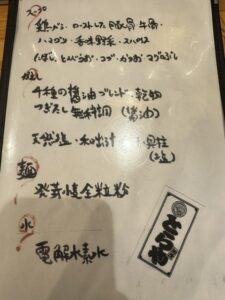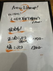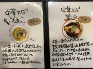 ねぎ・もやし・穂先メンマ1本を2つにカット・絶品ワンタン2個・肉の旨みを引き出した2種の低温調理チャーシュー2枚、ツルツルだが身の詰まった中細ストレート麺、チー油浮く無化調でなんとも複雑おいしい醤油スープ。ポルチーニ茸やトリュフが陰で仕事してます。今日のスープはカエシ少な目であっさり感じた。毎回ちょっとづつ違うのも個人店ならではの良さでもある。わたしの中では行列になった事にない( ´艸`)隠れた名店。メニューが綺麗に手書きリニューアルされていたのでアップします。ただ科学調味料じゃなく化学だが(笑)