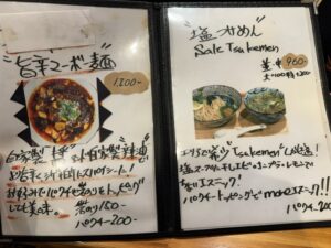もうお気に入りで連行。今回は平日限定の旨辛マーボー麺を頂く。「パクチーがのりますがいかがしましょうか?」との配慮。もちろんパクチー大好きだからOK(昔は本当に苦手だったが、長年の海外渡航経験から味蕾が拡がり好きになった)パクチー・糸辛子・白髪葱・斜めカットねぎがトッピングで、鍋で挽肉・ニラ・豆腐が具の絶品餡でとじた麻婆豆腐スープを作り麺にかける。麺は例の全粒粉ストレート細麺、最後に自家製辣油と山椒がふりかけられる。ベースの麻婆出汁が美味いんだ!本当に旨辛なバランスのいい麻婆麺です。ネギの食感もいいし野性的なパクチーも合うんだなコレが!パクチー苦手な人には大葉刻みも合う麻婆じゃないかな。ちゃんと穴あきレンゲも添えられてました。麻婆麺の中で高評価!!次はしおだ。やっぱりアタリでした