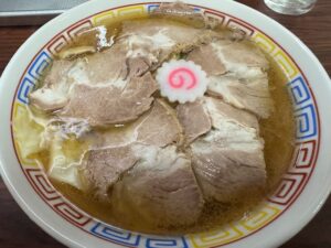 この日は醤油な気分でチャーハンも食べたかったのでこちらに。分厚いバラ角煮2枚・海苔1枚・ねぎ・メンマ・ほうれん草、味玉1個サービス、イキイキストレート中細麺、魚介ほんのり香るスッキリマルタ醤油スープ。その時食べたいスッキリ醤油にビンゴ!半炒飯は各店違うなってあらためて思いました。こちらはちょい甘みあり薄っすらウスターソースの香り。私はそんなに食べないけど、冷やしのメニューも掲げてました、暑い夏はアリかもです