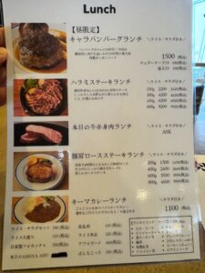 久しぶりにランチでお邪魔しました。感じのいい若い店員さん。食べ終わる頃にオーナーも登場し色々話しました。先ず牛すじスープ、深くてうまい、安いので是非サイドで!サラダ付きライス付きのキャラバンバーグは流石肉料理屋さんだけあってジューシーで肉肉しいおいしいハンバーグでした。