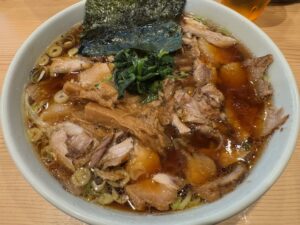 よく利用している堺東町店は木曜休みだがこちらは車でそこから5分で水曜休み、駐車場も広々、日曜という事もあって行列、店内に入って食券を買った後も待ち席がある。生姜ベースの正油と塩、デフォかチャーシュー、並175g・大盛250g特盛350gの組合せのシンプルメニュー。海苔1枚・輪切りネギ・メンマ・ほうれん草・スライスチャーシュー多数、多加水中太縮れ麺、生姜が効いた濃いキッコーマン濃口使用の醤油スープ。なるほどチャーシューからも生姜の味がした、こちらも生姜醤油で漬け込んである、部位や質は別としてチャーシューの量が嬉しい