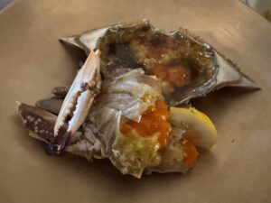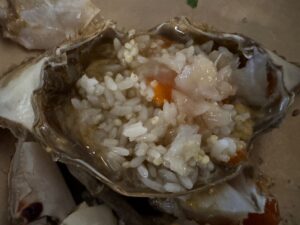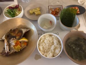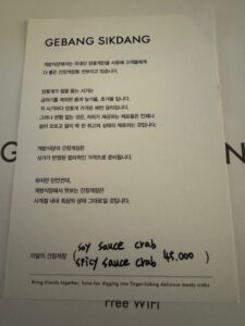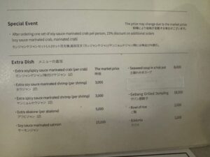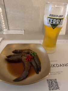 食べた品:生ビール330cc 6,000KRW・カンジャンセウ(生漬け海老)1尾3,000KRWx3尾・カンジャンケジャンセット45,000KRW・ハウスワイングラス8,000KRW 合計68,000KRW 7,480円