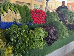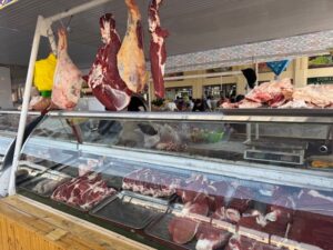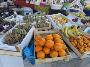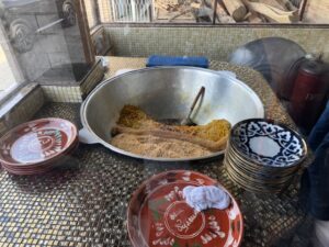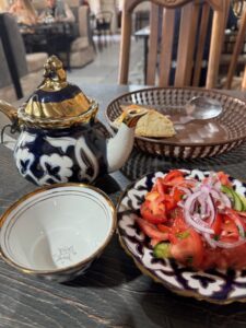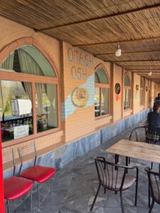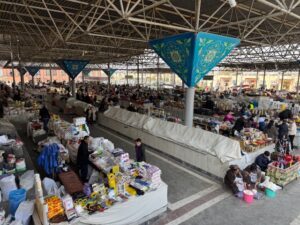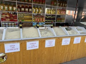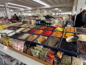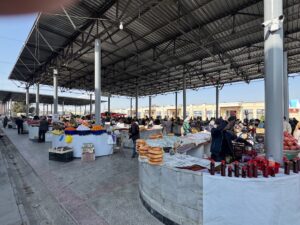Plov(ピラフ?)専門店、外席と内席があり一人と伝えると内席へ案内された、地元民が行くプロフ専門店でメニューはこれのみ。店員さんはかわいらしい民族衣装的なお揃いのエプロンみたいなのを着けている。人数分皿にのって来る、トマトサラダとパン、急須でお茶が用意される。プロフは何回かに分けて作っていて出来上がると一気に各テーブルへ届けられる。唐辛子1本・パプリカだと思ったやつは甘く煮た人参、その他白豆と甘い小さな葡萄と干し葡萄的なもの、くずし牛肉がトッピングされ硬めに仕上げられた米は食感がイイ!多分牛脂を使っていてかなり脂ギッシュ!でも美味いわ!普段ピラフに甘みは要らないがコレには合うかも、塩や胡椒で味変も出来る、後からもプロフ食べたけどここのが一番旨かった。以下の写真は市場の様子!後にも先にもこの旅で一番物価が安かったうちの市場の値段はさらに安かった。