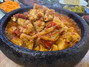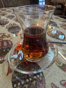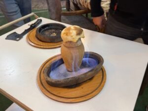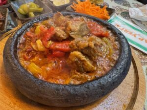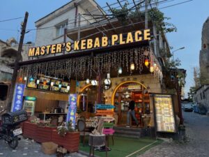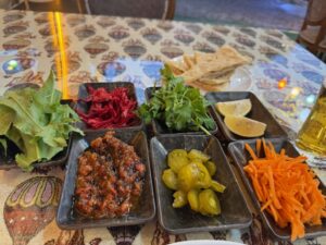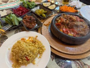 カッパドキア名物の壺入りで割ってサーブされるミートケバブ。演出含めて記念になるし美味しかった。付け合わせ?7皿とピタみたいなのが最初に来た、辛く見えそうな人参とパセリ・玉ねぎとりんご卸しみたいのとイタリアンパセリがいいね!ライスもついて最後まで熱々のミートケバブ美味し!ビーフの噛み応えのあるイイ感じ、味はトマト&オニオン・唐辛子などでクセは無し、ちょいピリ辛、やや脂っこいが味はいい。ライスはバター風味で日本人好み、量も一人でちょうどいい、というかキョフテ頼まなくて良かった。最後に熱いチャイサービス、腹一杯満足