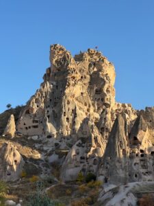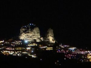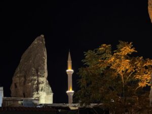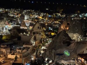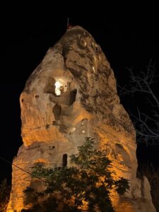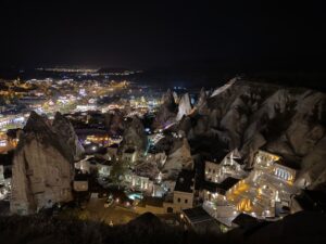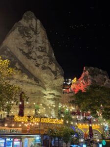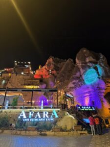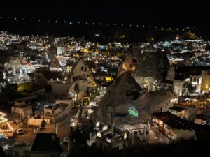 REDツアー(カッパドキアの奇岩を見てまわる1日ツアー)でツアー参加者全員で行くギョレメにあるレストラン、結論からいうと選んだものも悪かったのかもしれないが、トルコで一番まずい食事だった。気分を取り直してカッパドキア・ギョレメの夜の写真。素晴らしい奇岩とライトアップ