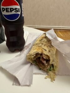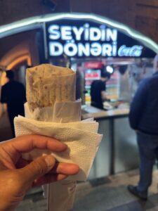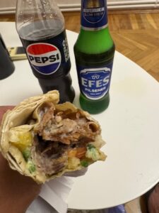 有名なNIZAMI通り近辺にあるドネルケバブスタンド、3軒並んでケバブ屋があるうち一番地元の人が並んでる店で、値段も書いてない、指差しと英語で何とか注文出来た。欲張ってエクストラミートにしなくてもよかったかな、、ちとしょっぱかったがボリュームたっぷり、トマトときゅうりとポテトが珍しい。肉はちょっと冷えてて硬め、宿の部屋で買っておいたビールとペプシと食べた。