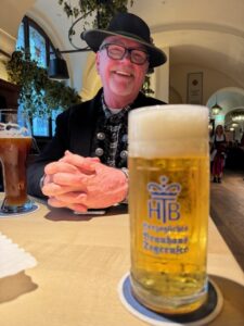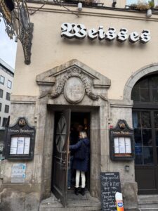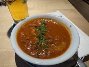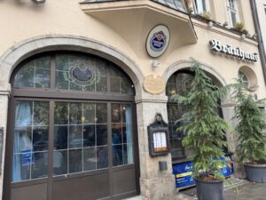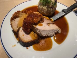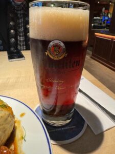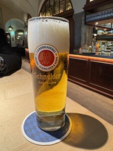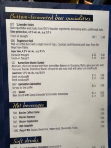 Schneider Helles 0.5l 5.4€このビール冷えてて今までで一番好き!変な癖もなく美味しい、Goulash Soup 8.90€ 酸味強めのビーフシチュー、ダイスカットさっれたビーフ、じゃがいも、ピーマンなどが入ったトマト味。Lager beer 0.5l 5.40€これもまずまず。Oven-fresh roast pork 16.90€ ビールのつまみに頼んだがややしょっぱい味付けだが案の定皮をパリパリに焼いたところが一番おいしい、そして昨晩食べたのと同じポテトと小麦粉の団子、これは要らない。豚の脂身は結構好きなのにほぼ赤身でボリュームがあった。Karmelltan Kloster 0.5l ダークビール0.5l 5.40€ こうなったら全種類飲もうか!と酔って頼んだ。Schneider weisse hefeweissbier 0.3l 4.20€ これはかなりクセのある酸味と苦み、私は苦手だった。Old Williams pear 41% 梨の強ーいショットグラス、コレが本当に美味しい~仲良くなったドイツ人から奢ってもらって、奢り返してを繰り返して結局合計5ショットも飲んだ(;’∀’)合計65€+チップ6.5€=71.50€=12,690円 結構高かったけどビールも食べ物も美味しかったし、雰囲気がいいし、仲良くなって飲み尽くしたドイツ人も楽しかったし大満足