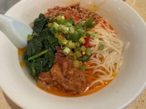 色々他を探したが、やっぱり高いのでここに来た。担々麺は青菜をはさんで辛挽肉と胡麻ペーストが分けられて提供、麺はなにかモチっとしたタイプの平麺、辣油がふられた単純スープに胡麻ペーストや辛肉が溶け出し坦々スープとなる。麺以外は良い。