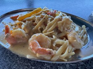 港に近い街のはずれの海が見える素敵な席。ピニャコラーダは安定の美味しさ。パスタは海老が9尾も入ったチーズクリームパスタでフェットチーネにパプリカ・ほぐしツナも?ブルーチーズの味もした。期待しないで入ったがアタリで美味しかった。クレブラ島は来る価値のある美しいビーチ。