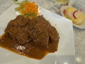 ミケロブは相変わらずすっきりおいしい。ゴート(山羊)の赤ワインソースとライスを注文したつもりだったけど、モフォンゴ?なんかの野菜煮込みだった。店員さん間違いに気づいてライスと豆のスープを持って来てくれた。骨付き含めてデカい山羊肉3ピース、山羊は全くクセが無く赤ワインに煮込まれてまずまず