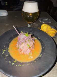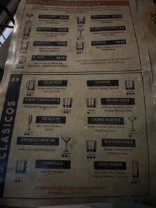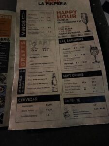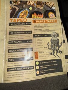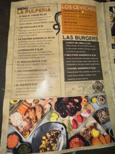 食べた品:DRAFT BEER PILS 10oz 3.99$・LOS CEVICHES PERUANO 11.95$・LAS SANGRIAS Tropical 7$・THE EMPANADAS10.95$・PULPE MULE 8$ 合計44.82$チップ入れて49.01$=7,683円