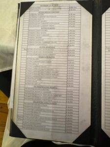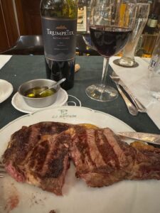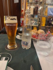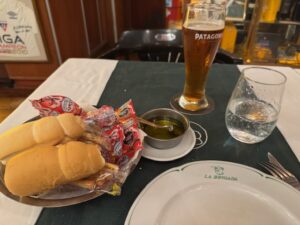 食べた品:AGUA CON GAS4,000リラ・CERVEZA PATAGONIA7,900リラ・キルメスチョップ6,900リラ・Bife de chorizo31,000リラ・TRUMPETER MALBEC29,000リラ 合計74,500リラ=8,000円位+チップキャッシュで10,000リラ合計9,100円位