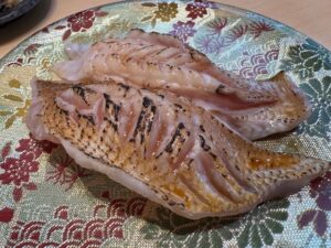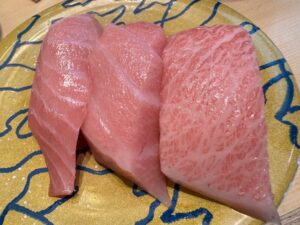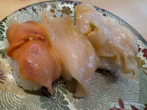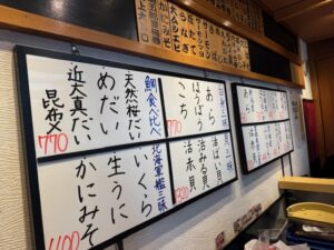 今回食べた品:鯛比べ(天然桜だい・めだい・近大真鯛昆布〆)770円+貝三昧(活ばい貝・活みる貝・活赤貝)1,320円+大人のトロ鉄火巻き715円+青魚三昧605円+特製ガラ汁220円+炙りのどぐろ1,210円+生本鮪三昧1,155円・ノンアルレモンサワー440円など合計6,435円