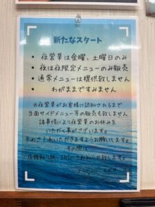 不定休、金・土のみ17:30~20:00ラストオーダー(昼:11:00~14:30)→通常のスガ井は検索で「メンドコロ」と入力すると見る事が出来ます