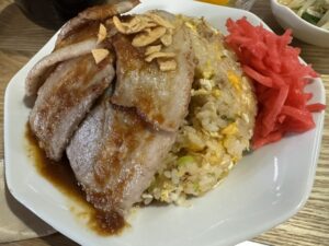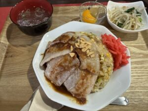 五泉に出来たランチのみの炒飯専門店。ノーマル炒飯は900円スタート。何かおかず的なモノも欲しかったので焼肉炒飯を選択。もやしを使った1品・塩中華スープ・寒天ゼリーが付いて、紅生姜が添えられ、ガーリックチップ、バラブロックカット焼肉5枚がトッピングされた塩が効いたしっとり炒飯。旨い、けどちとしょっぱかった