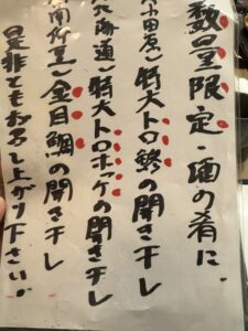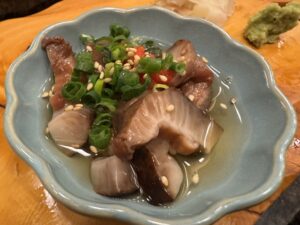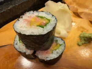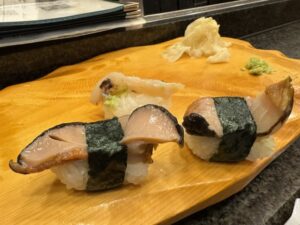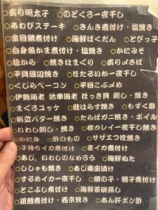 ひとり帰って野郎二人で野毛の夜はまだまだ続く(笑)まずお通しの3品が出てきた。品揃えメニューはあるし壁にもオススメがあるが価格表示が無い(;’∀’)まぁ野毛だからと半分安心しながら3軒目ながらまだまだ食う(笑)ビールや焼酎からここで日本酒に突入、、なまこ酢がなんだか苦手なホヤの味がしたのと平目の昆布〆は正直パッサパサ過ぎてエッと思ったがそれ以外の握りは満足。色々食べて飲んだがひとり1万切る感じでリーズナブルだった。さすが野毛!