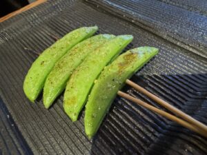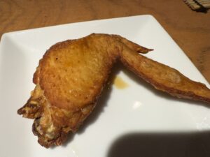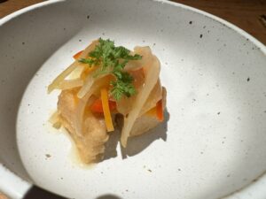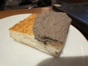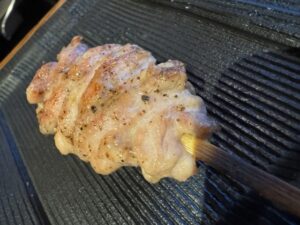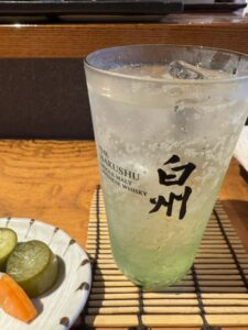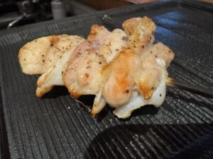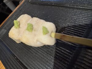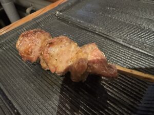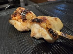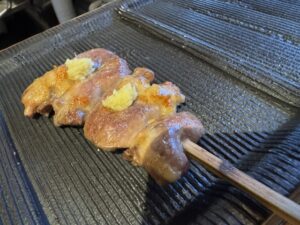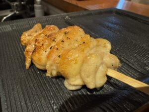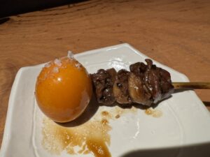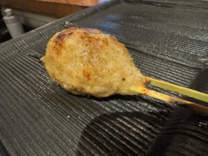 前に里葉亭で感動して系列店の関内に出来た「美鶏」もチェックしていた。キンキン音が鳴る備長炭を使用。コースで糠漬けから始まりハツ・セセリ・スナップエンドウ・ササミ山葵・焼いたパンと白レバパテ・パリッパリに揚げられた手羽先・大山鶏の南蛮漬け・塩つくね・ちょうちん・砂肝、ここまでがコース