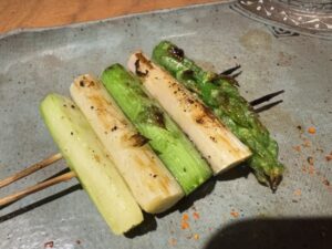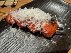 日曜(第一月曜も)定休、17:00~22:00。L字にカウンタ―8席・テーブル16席。里葉亭の系列店。予約必須、焼鳥おまかせ7,700円コース